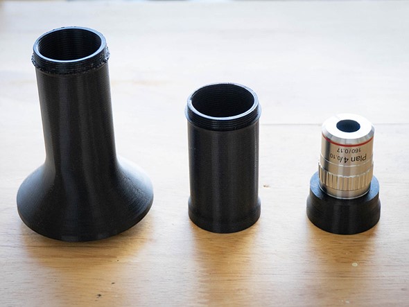 Sherlock has designed two adapters. One for APS-C cameras and another for full-frame cameras. The APS-C design includes a removable tube segment. Sherlock writes, ‘For objectives which cast a big enough image circle, removing this middle tube allows you to reduce the magnification and focus at a greater distance (for the 4x objective I tested this reduced magnification from 4x to 2.75x, and increased working distance from about 28 to 31mm).’