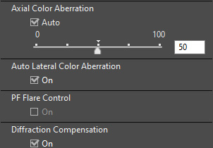 The selection of controls available to the user is sometimes a bit odd, though. For example, I’d wager that most NX-i users won’t have the first clue what “axial color aberration” means, nor will they find any tooltip explaining it if they hover over the control. Yet several more common (and easily-understood) attributes like distortion and vignetting corrections cannot be controlled by the end-user.