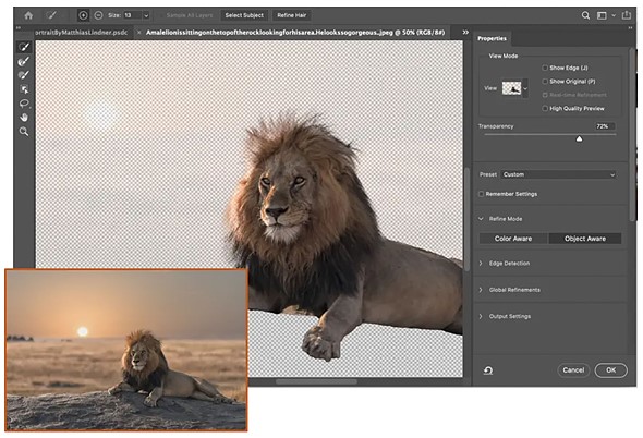 Making selections of hair has long been challenging, but Sensei now allows you to leverage its power to refine a selection incorporating hair in a single click. Similarly, Object Aware Refine Mode uses the power of AI to make even more precise, informed selections of portions of your image. Consider the example image below of a selection of the hair in the lion’s mane. It’s an impressive selection that was performed in only a few seconds.