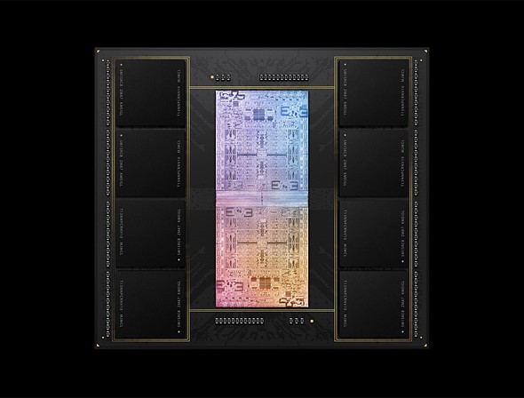 The M1 Ultra is essentially two M1 Max chips stacked end to end. Image: Apple |