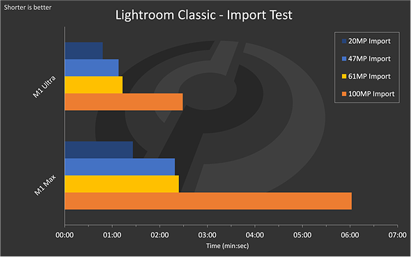 Generally speaking, Lightroom import and preview generation is a test of CPU performance while export is a test of CPU + RAM. In both tests, you would hope that the M1 Ultra with 2x the cores and 2x the RAM would be about… well… 2x faster. Incredibly, you’d be right.