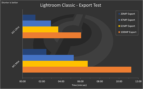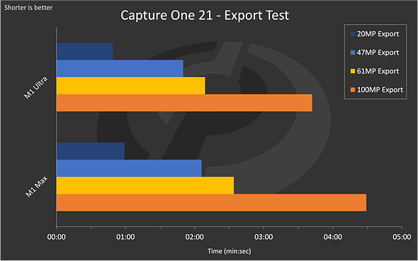At export, things are a bit faster. The M1 Ultra puts up export times that are up to 21% faster than the M1 Max. That’s certainly better than the meager difference we saw in our import tests, but it’s still nowhere near Adobe Lightroom Classic, which is a full 100% faster on M1 Ultra than M1 Max.