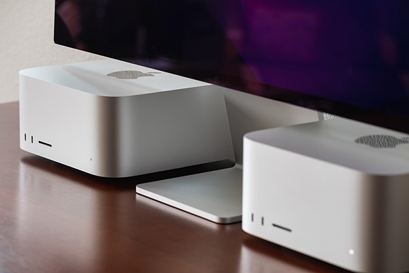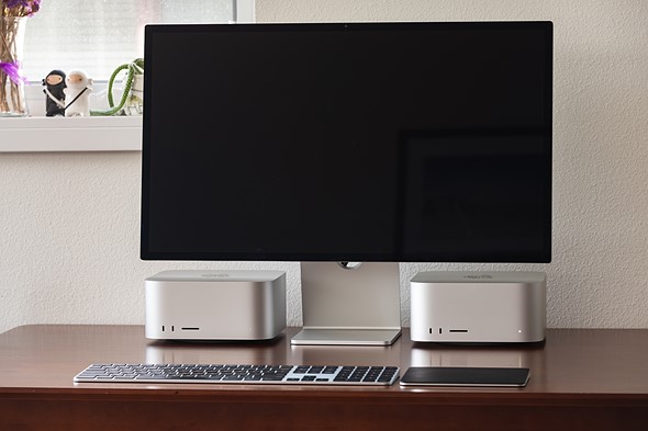 These two Mac Studio computers look identical from the outside, but one of them has twice the CPU cores, twice the GPU cores, and twice the RAM… |