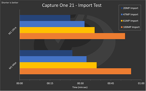 The latest version of Capture One Pro 22 (15.2) is 2x faster at import and preview generation compared to the previous release, but there is almost no difference between the performance you’ll get with the M1 Max and the M1 Ultra. At import, the two computers are practically identical: