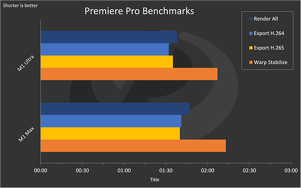 The story in Premiere is similar to Photoshop: there is a small performance difference, but nothing drastic. The M1 Ultra is about 9% faster at rendering and 5% faster at exporting H.264 and HEVC files.