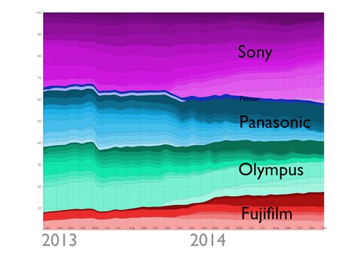 | A look at how compact system camera brands compare for popularity among Flickr users. Sony is enjoying the lion’s share by some distance. |