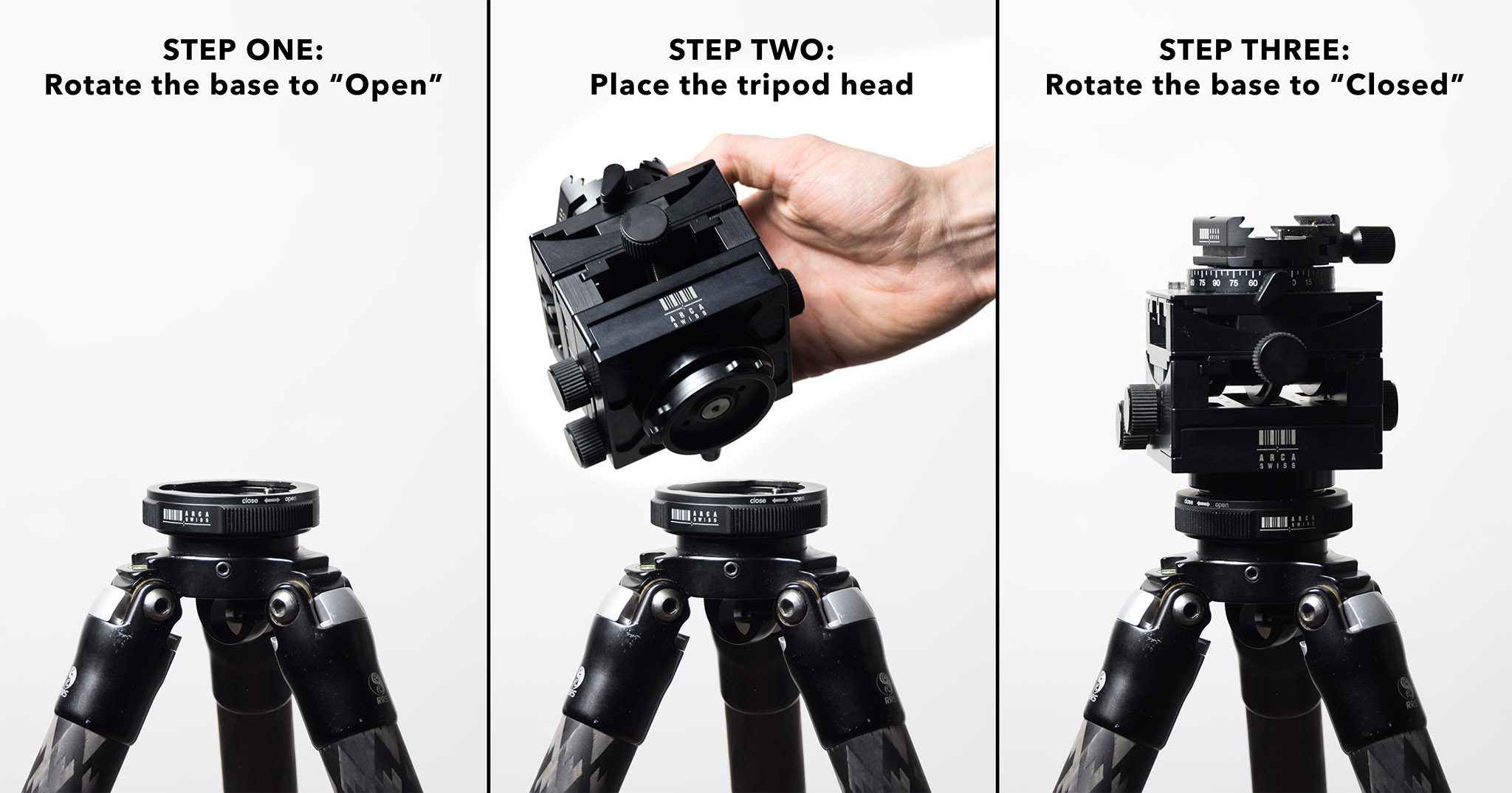 Once you’ve attached these two plates to your tripod and head, using them is a matter of rotating the base to the “open” position, placing the tripod head on top, and rotating the base to the “closed” position.