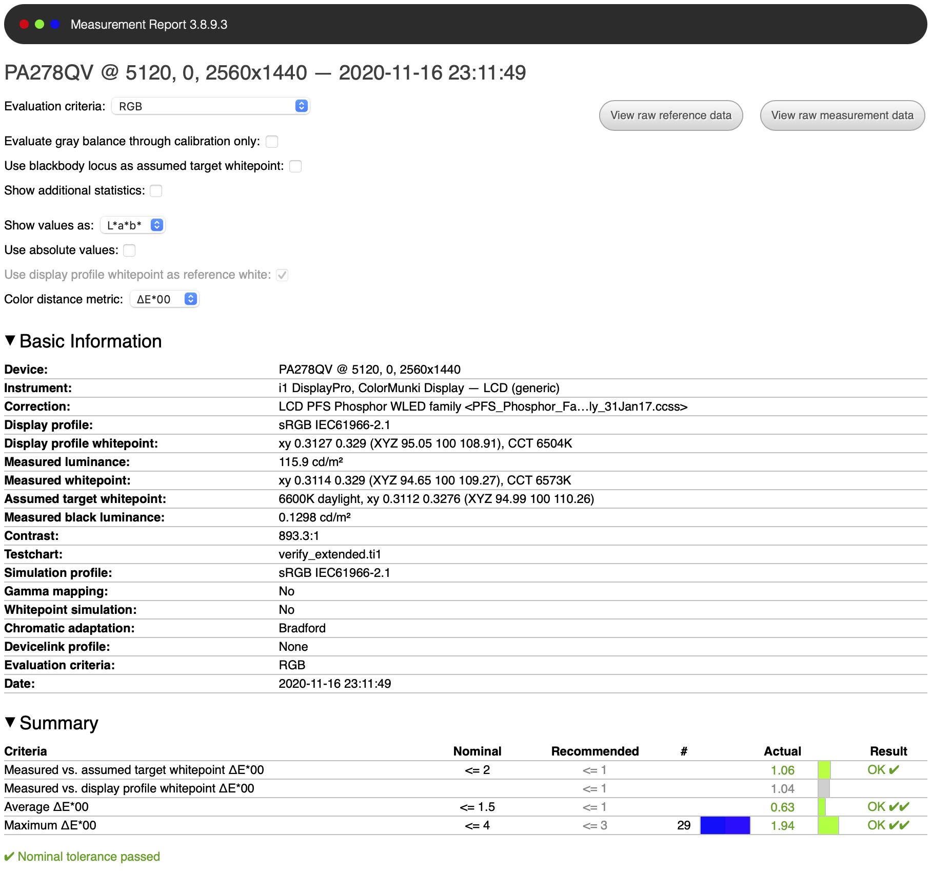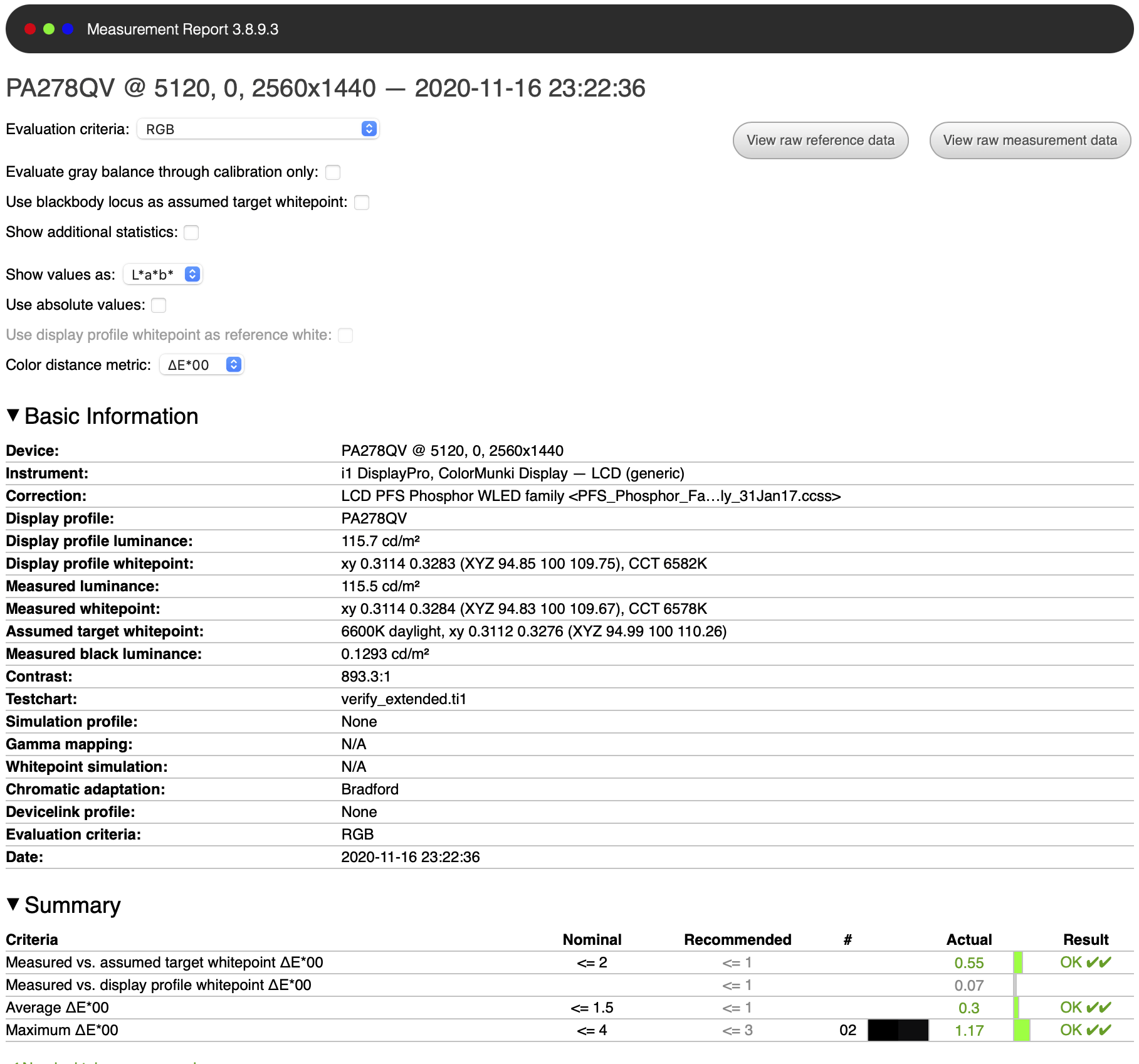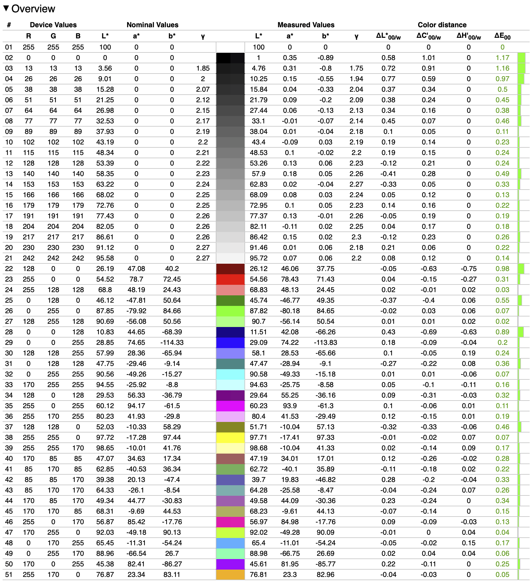 That’s actually pretty excellent. I was able to achieve 0.55 delta on whitepoint, 1.17 maximum delta on the blacks, and 0.3 delta on average. Here is a detailed report of all measured colors: