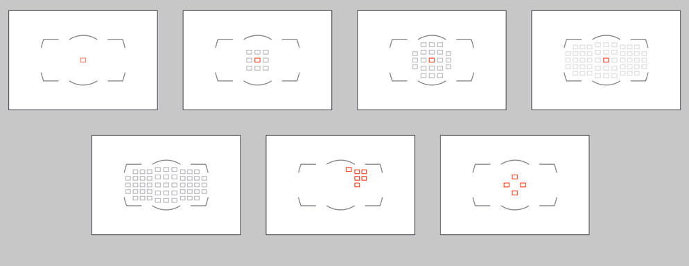 Clockwise from the top left: Single-Point AF mode, Dynamic-Area AF mode (9 points), Dynamic-Area AF mode (21 points), Dynamic-Area AF mode (51 points), 3D-Tracking mode, Auto-Area AF mode, and Group-Area AF mode.