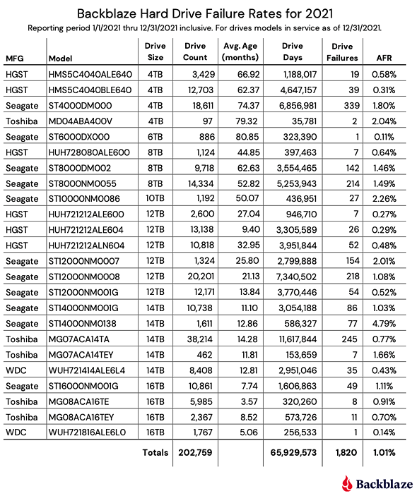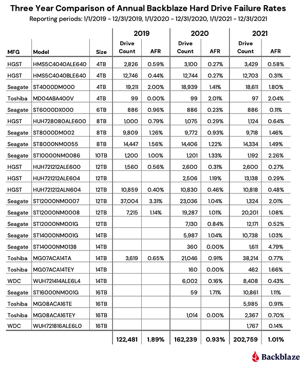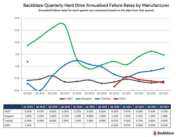 The total AFR for 2021 for all Backblaze’s drive models was 1.01%, which is slightly higher than in 2020 when the AFR was 0.93%. However, 1.01% is considerably lower than 2019’s AFR of 1.89%. Overall, HGST and WDC are the best performers over the last three years, with AFR under 0.5% in all but a couple of quarters. Toshiba comes up next with Seagate drives offering the highest AFR. Of course, when you dig into the data, you find that there are drives from each manufacturer that perform well.