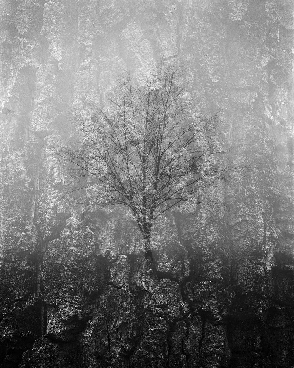 I always wait until the beginning of the next month to develop my film so as to allow for a personal disconnect from the compositions. As I waited, I had little hope that the double-exposed sheet would turn out usable at all. My guess was that it would show some extremely high-key remnants of the bark, and probably not much else.