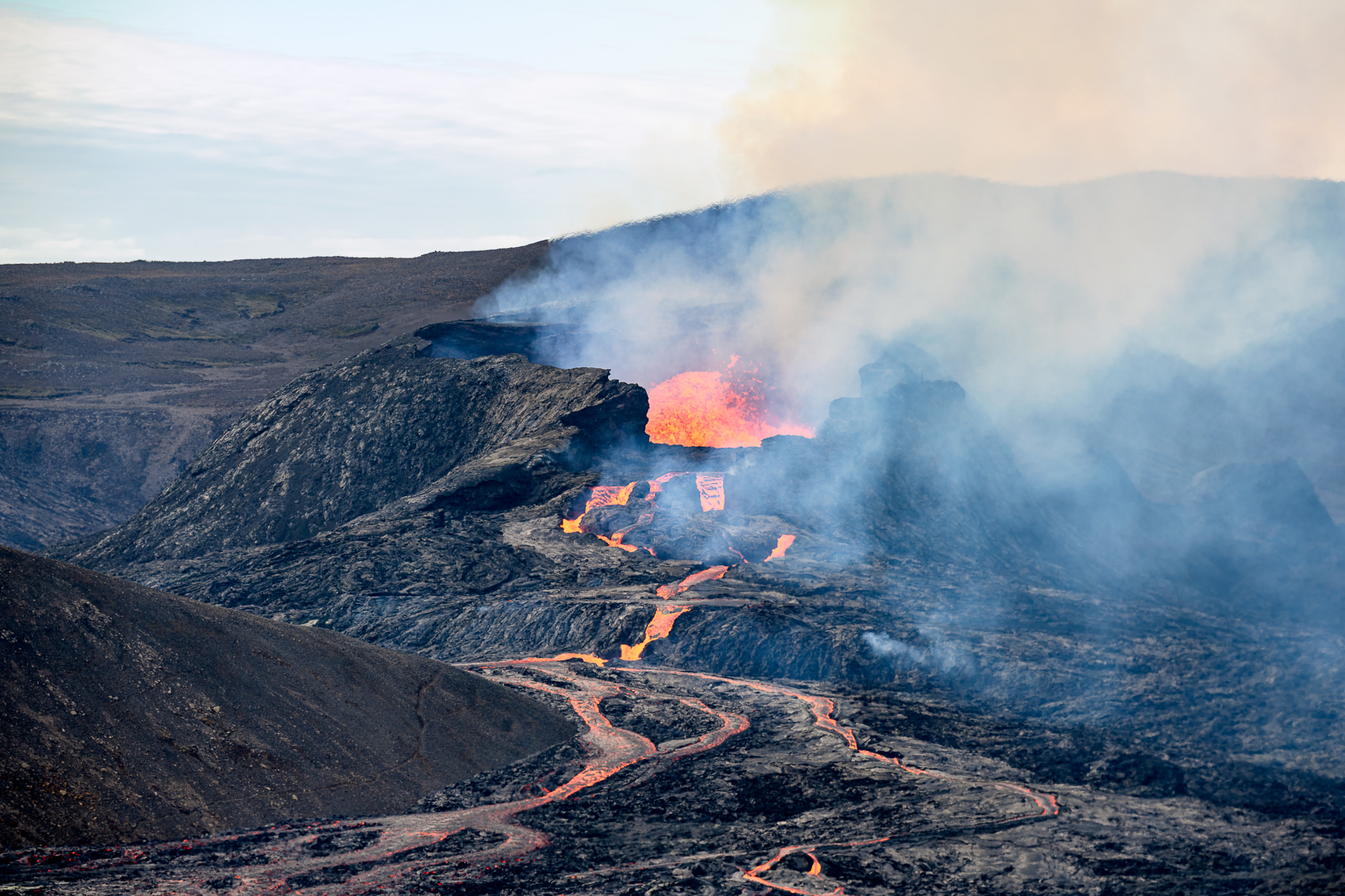 On the last day of the Iceland trip, I decided to see the erupting volcano close to Reykjavik. I knew I wouldn’t be able to approach the volcano from close-up (the previous hiking trail to the volcano was closed due to lava flowing over the trail), so I decided to shoot it from the distance at 200mm while trying to keep the camera steady with 80-100 MPH wind gusts. It was a fun experience, but the heat waves from the hot lava made it almost impossible to capture sharp images. I will document my experience shooting the volcano with my drone in another article.