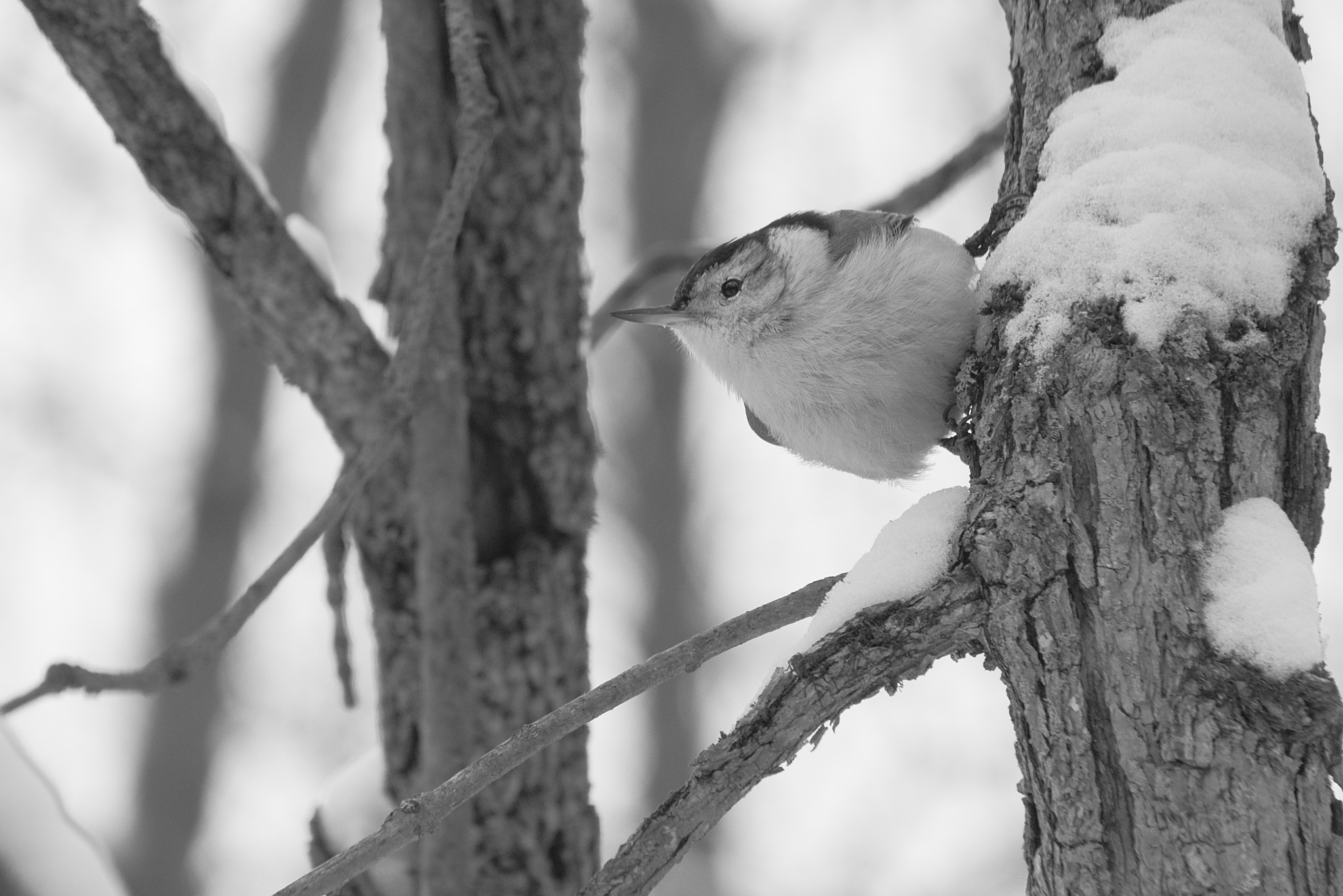 By getting to know the different bird species and how they behaved, I got a feeling for when certain species would be still. And I can say that even with my current faster equipment, paying attention to animal behaviour has been tremendously helpful. For example, at a certain time of year I know that the White-breasted Nuthatches where I live like to spend a bit of extra time perched near the bases of trees, and that has allowed me to get plenty of nice, eye-level shots of them.