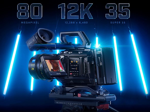The URSA Mini Pro 12K has a 12,288 x 6480 12K Super 35 image sensor with 14 stops of dynamic range with a native ISO of 800. The 80MP image sensor works with new color science and records Blackmagic RAW files. Blackmagic writes, ‘Oversampling from 12K gives you the best 8K and 4K images with the subtle skin tones and extraordinary detail of high-end still cameras.’