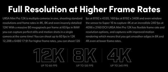 The URSA Mini Pro 12K records 12K footage at up to 60 frames per second. If you need faster framerates, the camera records 8K footage at 120fps and 4K Super 16 footage at a super-fast 240 fps. The camera includes an interchangeable PL mount, includes built-in ND filters (2, 4 and 6-stop filters), dual CFast and UHS-II SD card slots, a SuperSpeed USB-C expansion port and much more.