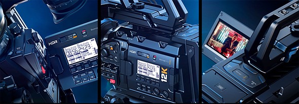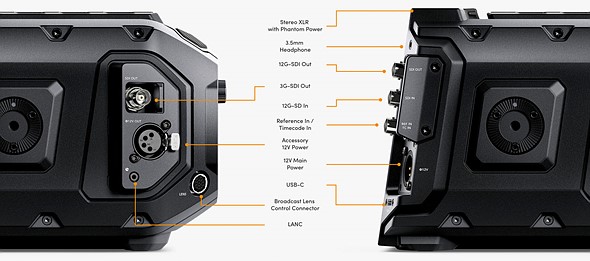 The camera includes a 4″ fold-out touchscreen to review shots and access menu settings. There’s an external backlit LCD for displaying critical shooting information. The camera includes 12G-SDI in and out, USB-C, 48V phantom power XLR audio, timecode and reference in. The magnesium alloy body has an optional Blackmagic Shoulder Mount Kit.