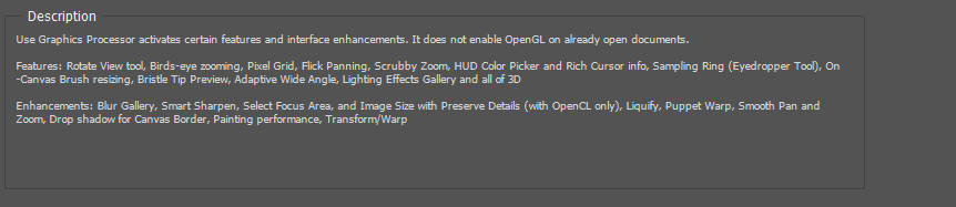Photoshop does not demand top-of-the-line 6 GB or above graphics cards, as I have mentioned earlier. In fact, except for a few options, Photoshop does not need to use your graphics card at all. Those exceptions are shown below: