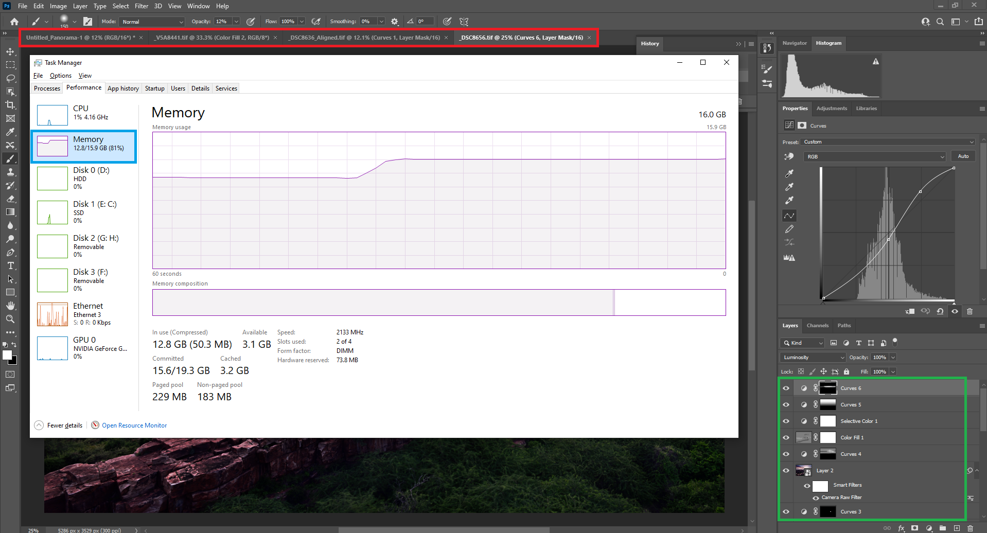 As you can see, I have opened four images (marked red) in Photoshop, all of them 16-bit TIFFs. The smallest file was about 2.5 GB, and the largest was about 4.5 GB. Each file had at least ten layers (marked green). Most of us generally do not open that many large files simultaneously. But despite the heavy use, you can see that my memory usage is only 81% of the total available memory of 16 GB. (Of course, to utilize dual-channel capability, I used 2×8 GB rams slotted in the 2nd and the 4th slot as recommended by the manufacturer.)