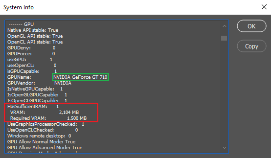 As for GPU RAM, you can see that Photoshop will work with a system with anything over 1500 MB of RAM.