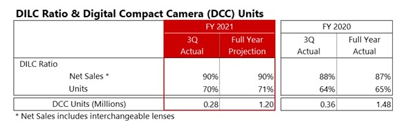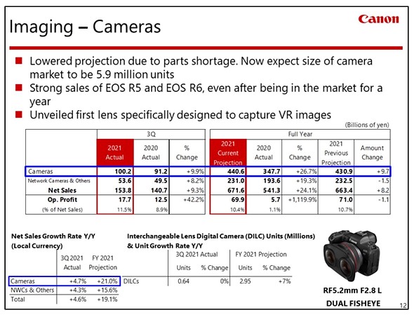 Regarding the ‘parts procurement,’ Canon says it expects to sell 50,000 fewer units than it originally anticipated for its FY2021, due to ongoing supply chain issues. Canon now projects it will sell 2.95 million digital interchangeable lens camera units, 50% of the 5.9 million units it expects the entire camera industry to sell. Despite the decrease in unit sales, however, Canon has actually increased its anticipated revenue from its camera division 2.25%, upping it to 440.6B yen from the previous 430.9B yen projection Canon had made.