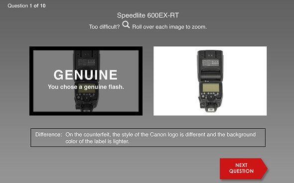 The first question of the quiz shows off a genuine Canon Speedlite 600EX-RT next to a counterfeit version.