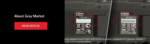 In addition to counterfeit products, Canon also provides a detailed guide on gray market products, which don’t carry the same warranty and support as regional camera equipment.