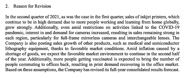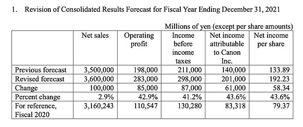 Canon’s breakdown of the forecast changes its made for its 2021 fiscal year. |
