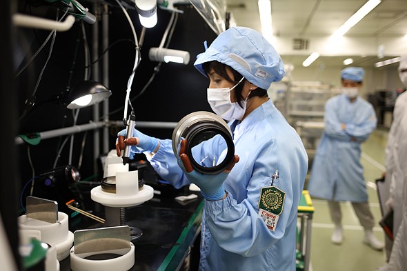 A Canon assembly line Meister (her badge tells us she’s been a Meister for 17 years) works on the front assembly of a telephoto prime lens. Taken by DPReview in 2017. |