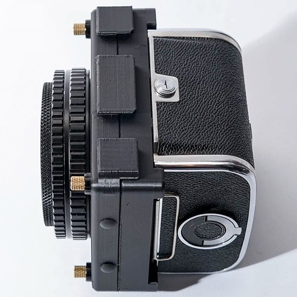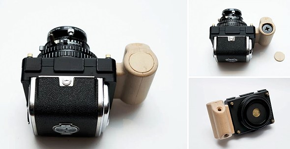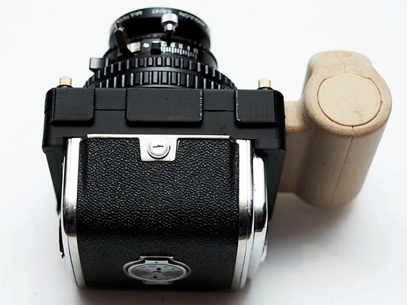 These standard components connect using a physical interlock and four ‘very strong neodymium rare-earth magnets’ in each section. Additional accessories can also be attached using integrated mounting points on each side of the mid-body. Photographers can purchase an additional cold shoe plate and a basic tripod mount to add to their 679 camera system. Further, there’s an available full grip with an integrated tripod thread, internal storage for a roll of 120 film, and a passthrough mount for a cable release. The grip is available in black and wooden printed materials for either left- or right-handed photographers.
