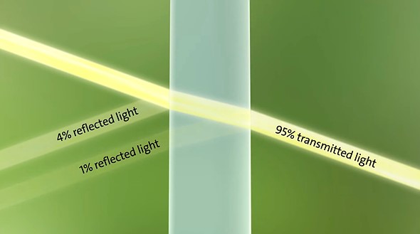 Compared to this traditional optical element with an anti-reflective coating applied only to the back of the element (seen right on this image), Corning claims Gorilla Glass DX and DX+, which is applied to the front of the optical element (seen left in this image), increases light transmission to 98%, according to Corning.