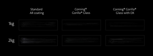 A visual representation of the scratch-resistance of Gorilla Glass DX and DX+ compared to optical elements with standard AR coatings (Corning didn’t divulge what specific coating was used for this comparison. Click to enlarge.