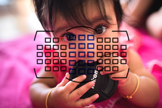 | Nikon’s 3D tracking offers class-leading subject tracking, allowing the camera to track an initially chosen subject (the eye, in this case) despite subject, or camera movement. Cross-type AF points (shown in blue), however, are limited to the central region only. |