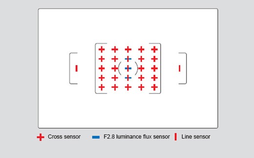 | This image (supplied by Ricoh) shows the Pentax K-3’s AF system. As you can see, the AF coverage is relatively small, and the camera’s cross-type AF sensors are limited to the central area of the frame. |