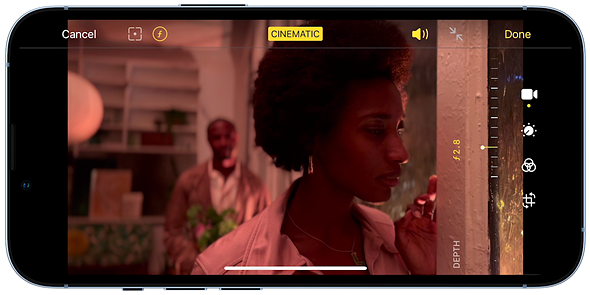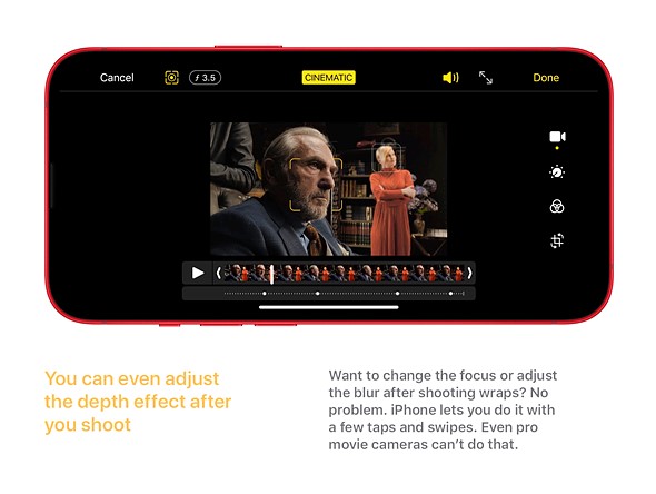 With the iPhone 13/mini and iPhone 13 Pro/Pro Max, you can adjust the focus and f-stop in video after the fact. The interface appears to be similar to the one for Portrait Mode for stills.