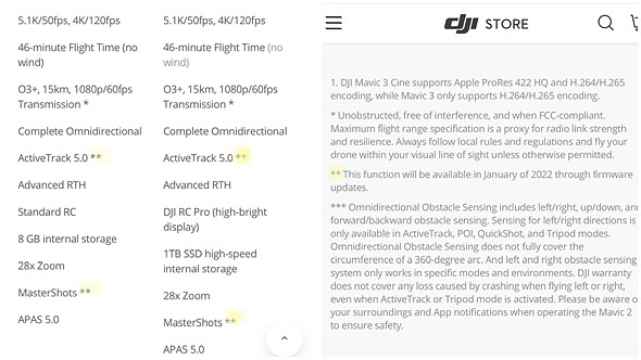 If you go to buy a Mavic 3 on DJI’s official site, you’ll notice two asterisks next to features followed by a disclaimer stating they’ll be available with a firmware upgrade in January 2022. |