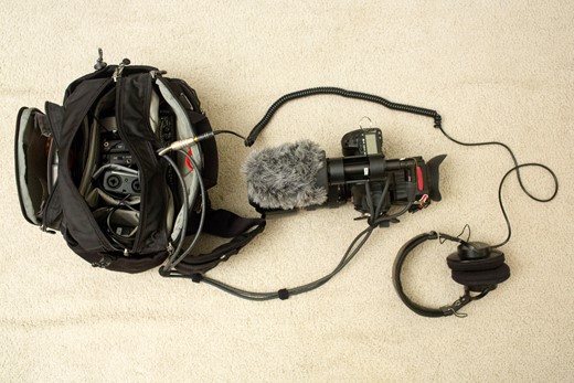 I stuff the mixer, receivers, a Zoom H4N for backup audio, 1.4x extender, batteries, cards, etc. into a Think Tank Multimedia waist bag. It’s good, but I’d like to find a solution more like the Newswear vest that keeps the gear close to my body and above my waist and legs. Running and getting in and out of the cop cars was a bit difficult.