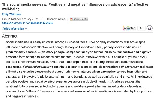 Interestingly, Newton never directly cites Facebook’s own research in the article, opting instead to present the results from a Harvard University study that ’described the “see-saw” of positive and negative experiences that US teens have on social media’ as well as a Pew Internet study on teens in the United States which said ’81% of teens said that social media makes them feel more connected to their friends, while 26% reported social media makes them feel worse about their lives.’