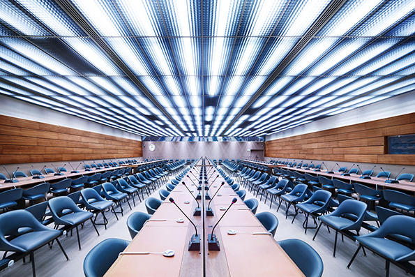 Zanier has photographed buildings in New York, but much of the series is focused on the power houses of Europe. He chooses the buildings in part for their political significance, but also for their architecture and design. Alongside the UN buildings in New York, which are depicted with the lights fully on in his shots, giving them the appearance of futuristic spaceship interiors, Zanier has photographed the headquarters of the French Communist Party in Paris, which was designed by Brazilian architect Oscar Niemeyer and features a striking ceiling design. “[The building] needs a good story,” says Zanier. “It needs a good architect. For example, I was in Switzerland at the World Trade Organisation, which is a really important institution, but the rooms there are just normal so I preferred not to take the picture. For me, every picture has to be strong.”