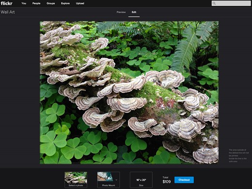 Flickr users will find the Wall Art feature under the Share button (small arrow) on each individual photo page. The first option is Photo Mount, with these prints featuring a lustre finish on Fujicolor Crystal Archive Paper mounted on a 1-inch black board that, says Flickr, has wood texture around the edges. The second option is Canvas Wrap, which is mounted on a frame promised to have square corners and impact-resistant construction.