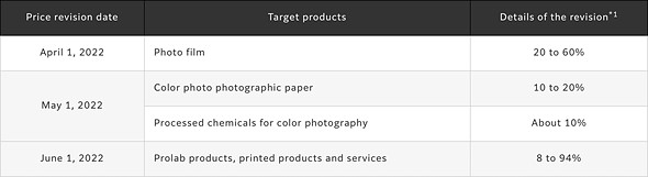 In a rather simple press release shared on Fujifilm’s website, the company says it has ‘been working hard to absorb costs by improving production efficiency and saving costs,’ but says ‘corporate efforts’ only can only go so far. According to a chart Fujifilm provided in the press release and embedded below, film prices will increase between 20–60% while photographic paper and chemicals will increase by 10–20% and ‘about’ 10%, respectively.