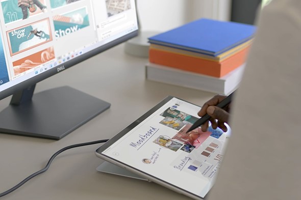 The new 13″ PixelSense Flow Display is larger, both in physical dimensions and resolution, than previous Surface Pro devices. The 2880 x 1920 pixels(267 ppi) multitouch display runs at 60Hz by default, but supports up to 120Hz refresh rate, and will intelligently alter the framerate to optimize performance when needed and battery life for less resource-intensive tasks. The display offers Dolby Vision support for high dynamic range (HDR) content and works with the new and improved Surface Slim Pen 2 to offer a unique writing experience that matches the feeling of a pen on paper, according to Microsoft.