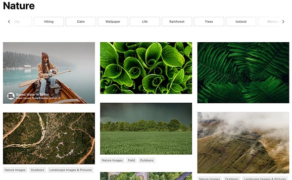 Search results for ‘nature’ images featuring the color green in landscape orientation. In the top left you can also see an Unsplash for Brands image for Boxed Water. |