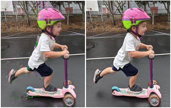 To reduce ghosting artifacts caused by motion, Google says it’s designed a new spatial merge algorithm, similar to that used in its Super Res Zoom technology, ‘that decides per pixel whether image content should be merged or not.’ Unlike Super Res Zoom though, this new algorithm faces additional challenges due to the long exposure shots, which are more difficult to align with the reference frame due to blown out highlights, motion blur and different noise characteristics.