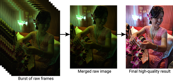 ‘To start, adding bracketing to HDR+ required redesigning the capture strategy. Capturing is complicated by zero shutter lag (ZSL), which underpins the fast capture experience on Pixel. With ZSL, the frames displayed in the viewfinder before the shutter press are the frames we use for HDR+ burst merging. For bracketing, we capture an additional long exposure frame after the shutter press, which is not shown in the viewfinder. Note that holding the camera still for half a second after the shutter press to accommodate the long exposure can help improve image quality, even with a typical amount of handshake.’