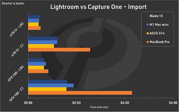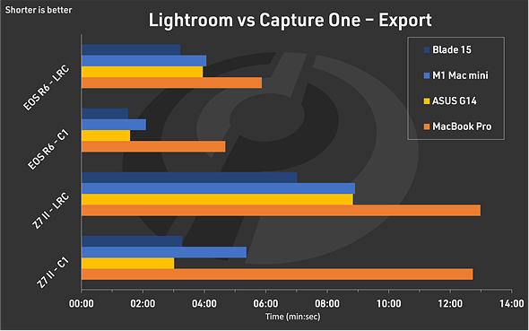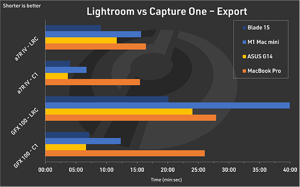 Our ASUS G14 was able to export all one hundred Fuji GFX 100 raw files, fully edited, in just 6 minutes and 39 seconds when using Capture One. This same export, with the same edits, took more than 24 minutes in Lightroom Classic. Even the M1 Mac mini, which doesn’t have a discrete GPU to pick up the slack, saw export times drop by up to 27 minutes when switching from Lightroom to Capture One.