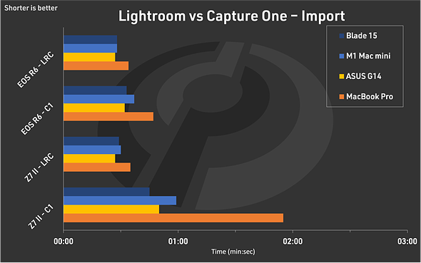 You can see all of the data in the tables and graphs below. Times are minutes and seconds, and the winner for each computer/camera combo is highlighted in green.