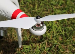 | The remote controller with DJI Vision app-enabled smartphone and WiFi range extender hiding behind it. | The propeller motors are simply miniature stator motors. |