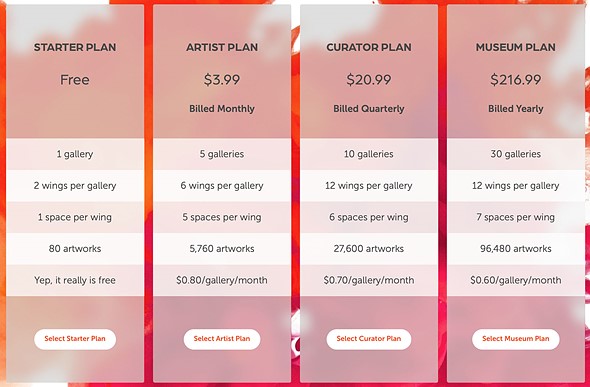 If you’d like your own gallery with four separate wings, you will need a paid plan. The free plan includes one gallery and two wings. You can host up to 80 artworks in the free Starter Plan. For $3.99 per month, you can host five galleries with six wings per gallery and share a total of 5,760 artworks. Additional plans add more galleries, wings, spaces and artwork capacity, up to 96,480 artworks for $216.99 per year.