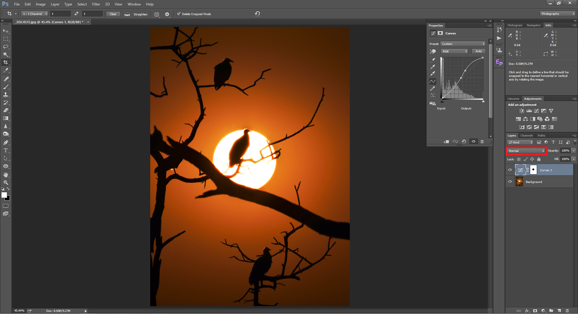 Let’s say I want to darken the image and add a hue of saturated blue to the sky. It is a simple two-step process with the Color burn blend mode, as shown below: