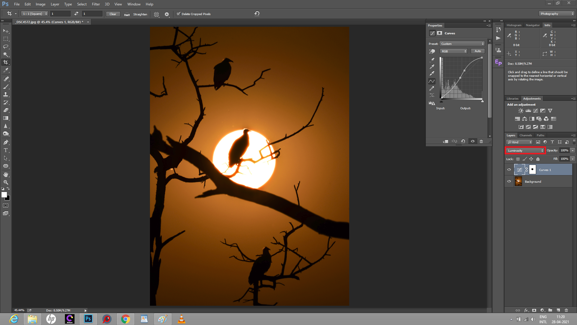 As you can see, I have applied a simple curves adjustment layer to enhance the contrast. But you will notice that the effect looks overdone. Sometimes, it’s difficult to make accurate adjustments with the adjustment tool itself. The opacity slider comes to the rescue in such conditions. All I have to do to decrease the strength of this adjustment is bring down the opacity of the curves layer. The image below is the result, where I brought down the opacity of the curves layer to 42%: